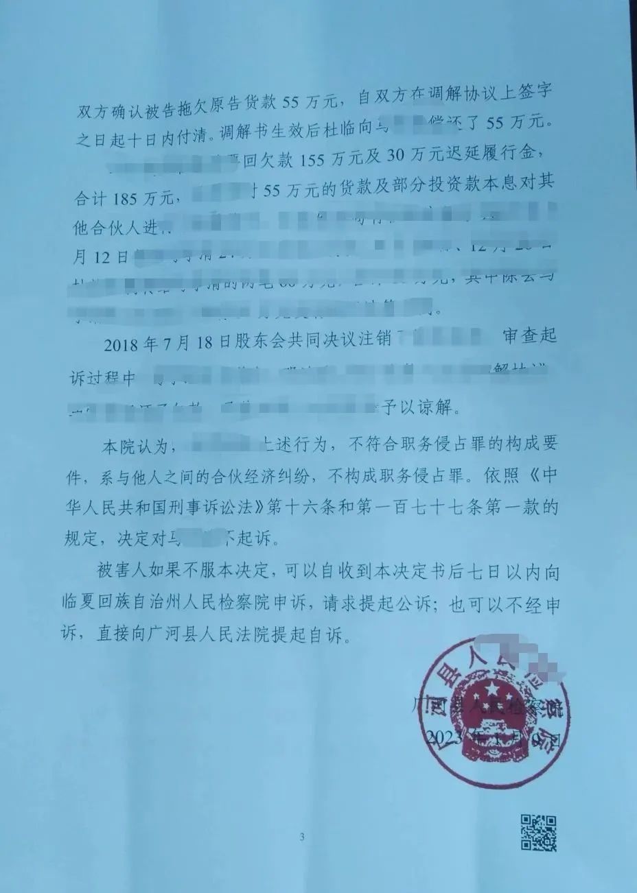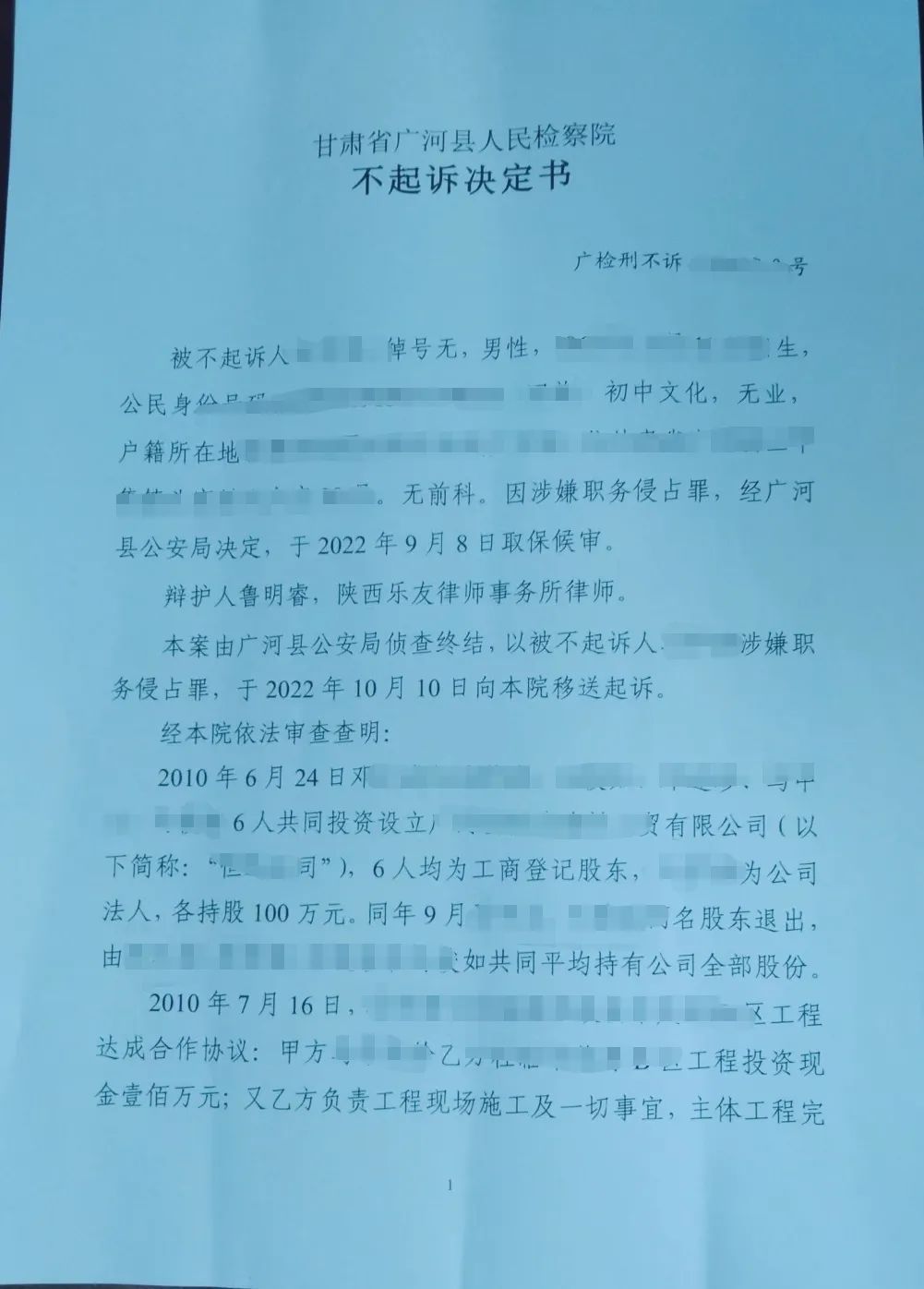 2022年,广河县公安局以涉嫌职务侵占罪将当事人相关案件移送检察院。2010年,当事人与邓某等6人成立建材工贸公司,各持股100万元,之后部分股东退出。同年7月,当事人与杜某达成工程合作协议,分批投资100万元。而后杜某应按照约定支付投资本金及红利,但杜某未如约支付。当事人起诉,经法院调解后杜某亲属陆续归还欠款及迟延履约金185万。当事人收回款项后进行部分清算,但还有66万元(除去自己15万元后剩51万元)未清算分割,成为职务侵占指控的源头。