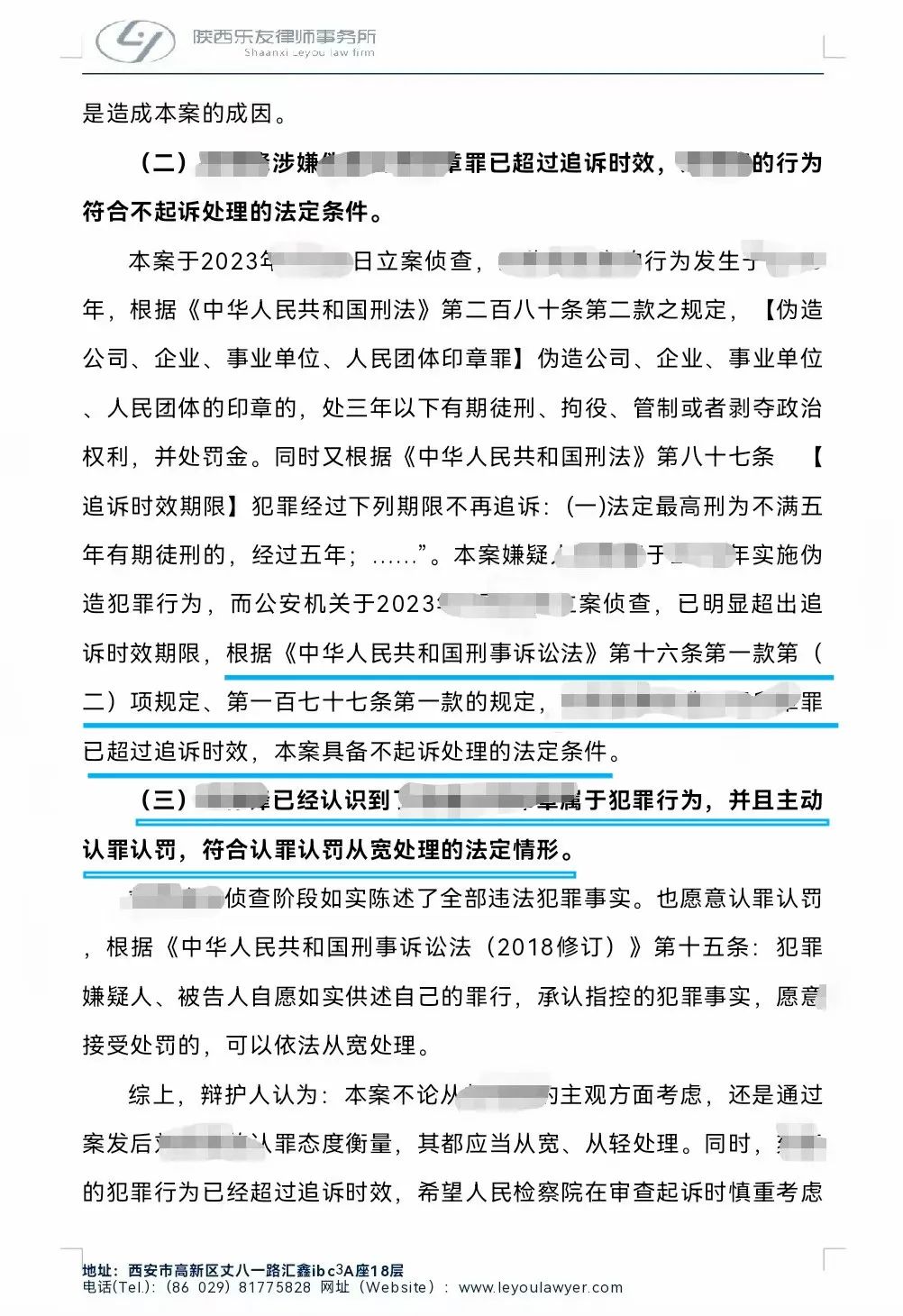 鲁明睿律师介入案件后,立即对案件的全部卷宗进行了仔细研读,不放过任何一个细节。通过对案件发生时间、印章刻制及使用过程的深入研究,精准把握了追诉时效这一关键要点。根据刑法规定,伪造公司印章罪法定最高刑不满五年有期徒刑,追诉时效为五年,当事人2016年伪造印章,2023年公安机关立案侦查,已超追诉时效。此外,当事人到案后如实供述,自愿认罪认罚,具有从轻处罚的情节。鲁明睿律师依据这些事实和法律规定,撰写了详细的法律意见书,向检察机关充分阐述了相关情况。最终,检察院采纳意见,决定对当事人不起诉。