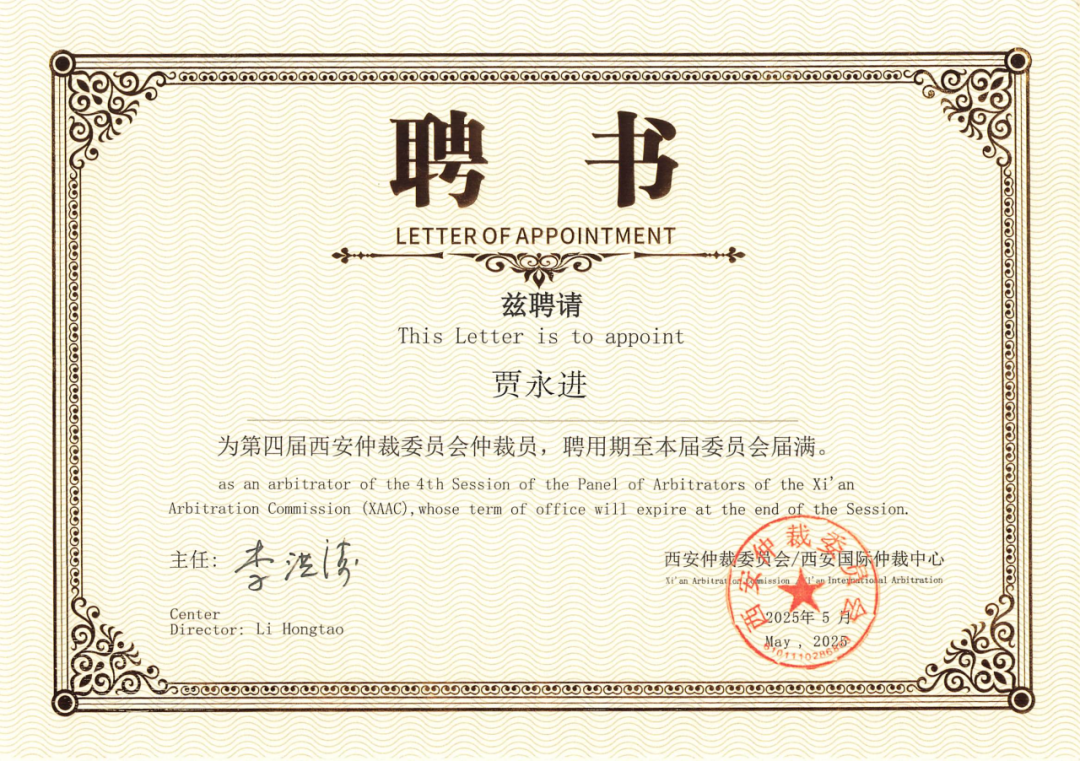 乐友律师 | 贾永进续聘担任西安仲裁委第四届仲裁员
